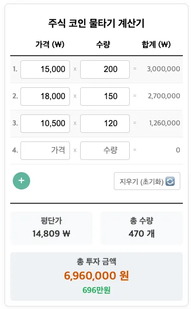 주식 코인 물타기 계산기 입니다. 아래에 매수 금액과 수량을 입력해주세요.